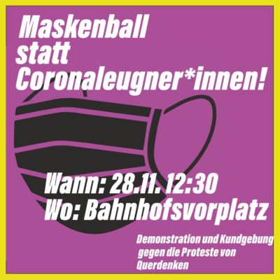 Demonstration des Bündnis „Kein Ort für Nazis in Frankfurt (Oder)“ Ort: Bahnhof Frankfurt (Oder) Datum/Uhrzeit: 28.11. 12:30 Uhr „Weltweit bedroht das Coronavirus Menschen und die Gesundheitssysteme. Es werden weltweit Maßnahmen…